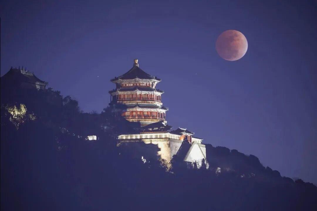 颐和园佛香阁与红月 顾彩华摄